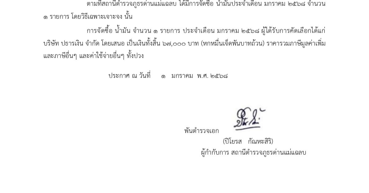 ประกาศผู้ชนะการเสนอราคาการจัดซื้อน้ำมันเดือน มกราคม 2568